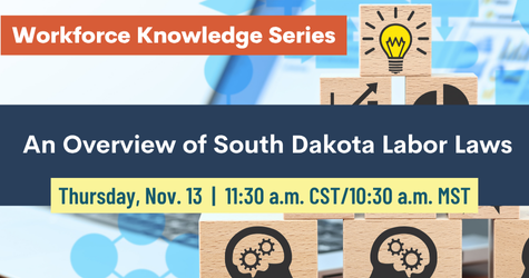 Our November Workforce Knowledge Series Session is all about South Dakota's Labor Laws. Register today. Our Virtual Workshops can help you achieve personal and economic stability through education, skill advancement, and career development. Employers and job seekers can connect from wherever they may be during our Virtual Hiring Events. Free public Wi-Fi is available at all our Job Service offices. Visit SD.gov - enhanced search functions, online chat, and more online services than ever before. Check it out!